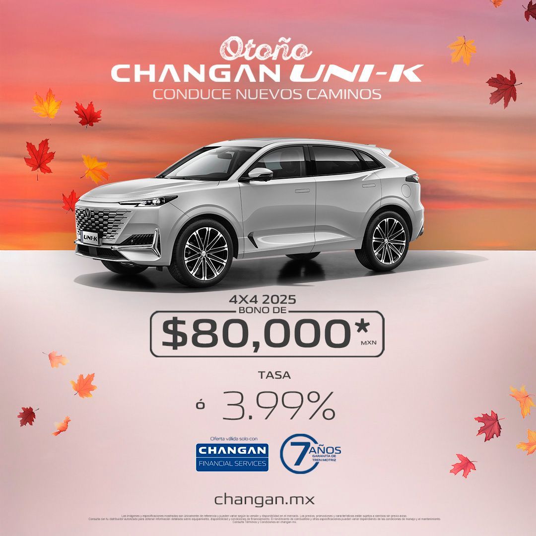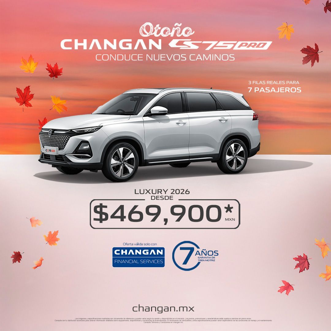 Toda la información contenida en este sitio web o red social, está basada en datos disponibles al momento de la publicación. Grupo Automotriz de la Baja se esfuerza en mantener la precisión, sin embargo, la exactitud no puede garantizarse. Grupo Automotriz de la Baja podrá utilizar o modificar las características e información del vehículo ya mostradas en este sitio web y red social. Algunos vehículos presentados incluyen equipamientos opcionales que pueden no estar disponibles en algunas regiones y pueden representar variaciones en los precios. Grupo Automotriz de la Baja por medio de la publicación de este material no crea garantía, impresa o implícita, de cualquiera de los productos de Changan México. Los precios y promociones mostradas en este sitio web o red social pueden cambiar sin previo aviso para mantenerlos lo más actualizado posible. Contáctatenos para obtener información detallada.